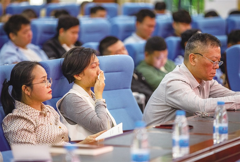 卜玉妹含泪讲述父亲卜甲运牺牲后,家庭陷入困境,在党委、政府、省见义勇为基金会、儋州市见义勇为工作协会的帮扶下,姐弟4人全部考上大学、如今3人已经工作的经历时,台下不少观众红了眼眶。