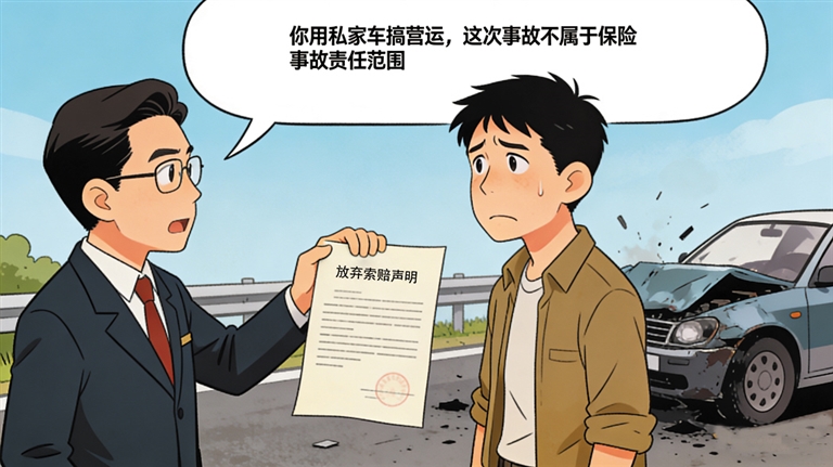 对于一辆投保时登记为“非营运家庭自用”的车辆来说,这直接触发了保险合同的免责条款。几天后,一份由某保险公司出具的放弃索赔声明摆在了符某面前。声明中明确写道:因营运性质,本人了解本次事故不属于保险事故责任范围,现声明放弃索赔……符某在该声明上签了名。