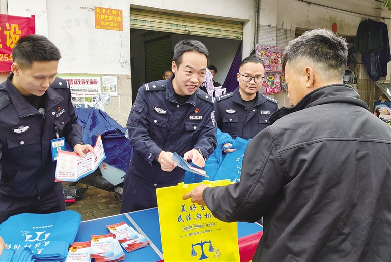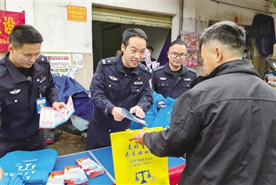 12月3日,白沙黎族自治县公安局联合县司法局、打安镇综治中心等多部门共同开展“宪法进集市”主题宣传活动。民警将集市变成课堂,向群众讲解公民的基本权利和义务、公民的住宅权等内容,并围绕宪法和日常法律常识设置法律知识有奖抢答题,提升群众学法热情。民警、辅警组成“流动普法小组”,到集市沿街商铺开展“入户式”精准普法,将宪法读本送给商铺店主的同时,结合近期诈骗案例,讲解针对个体工商户的电信网络诈骗手法和防范要点,引导店主守好自己的钱袋子。