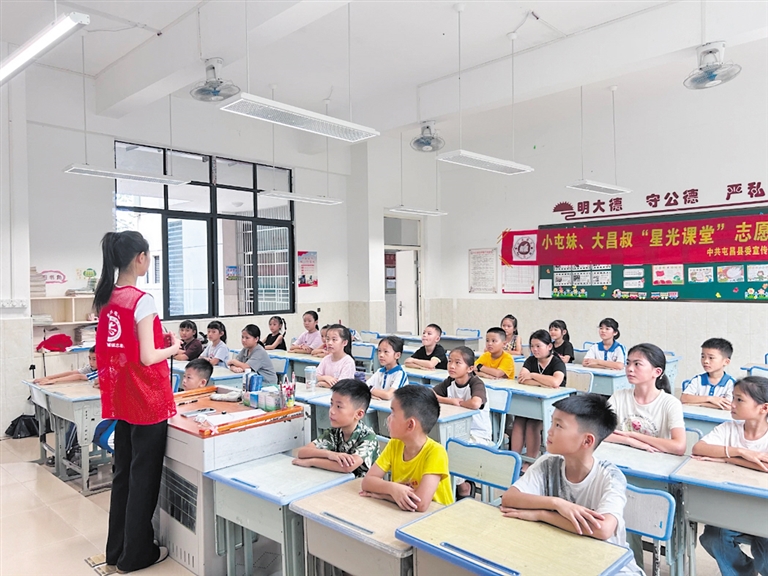 针对农村地区留守儿童在生活上缺乏关照,精神上缺少关怀,学习上缺乏管理,易受社会不良风气的诱惑和影响,甚至走上违法犯罪的道路等特点,充分发挥社区党建联盟、乡村振兴工作队坚强堡垒作用,通过组织“小屯妹大昌叔”志愿者开设星光课堂、爱心托管班活动、“点亮微心愿”“爱心妈妈+”等关爱留守儿童、困难儿童志愿服务活动,架起了党群“连心桥”,进一步筑牢家校社护苗防线。