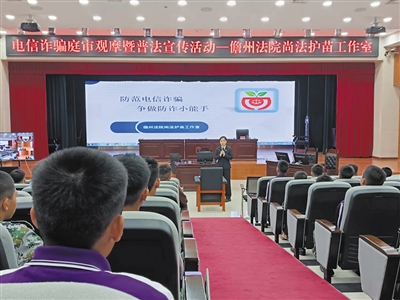 庭审结束后,儋州法院尚法护苗工作室工作人员以审判法庭为“教室”、真实案例为“教材”,开设普法小课堂,着重剖析违法犯罪行为对个人、家庭和社会造成的严重危害,不仅教导大家如何识别和防范诈骗,保护自身安全,更重点强调要避免因小失大而成为犯罪的“工具人”和“帮凶”。