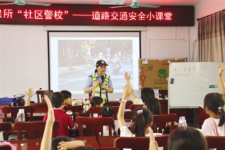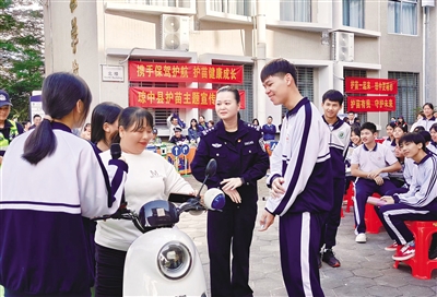 教化层面,琼中公安局打破传统普法模式,让法治教育“活”起来。在全省首创的“社区警校”里,民警变身“法治老师”,用情景剧、互动游戏等生动形式,将法律知识融入孩子们的日常生活。除了社区警校,琼中警方还打造“法治副校长进校园”品牌,成立“护苗”法治宣讲团,推出“开学第一课”“一月一主题”“安全知识大闯关”等互动式普法活动,让孩子们在游戏中学习交通规则,在欢笑中掌握安全知识。
