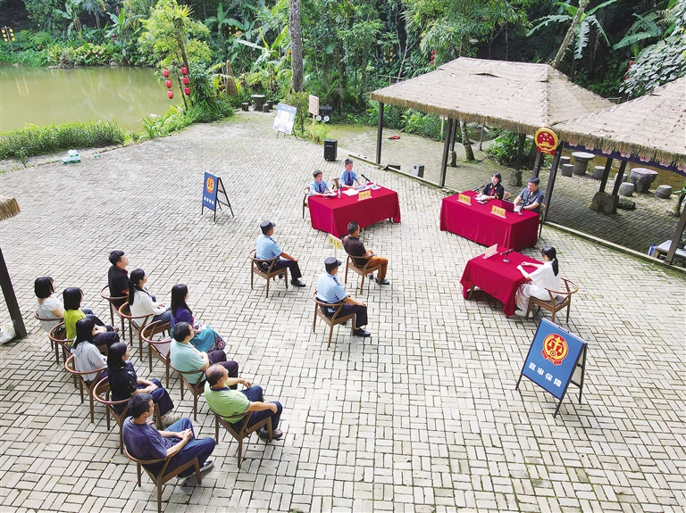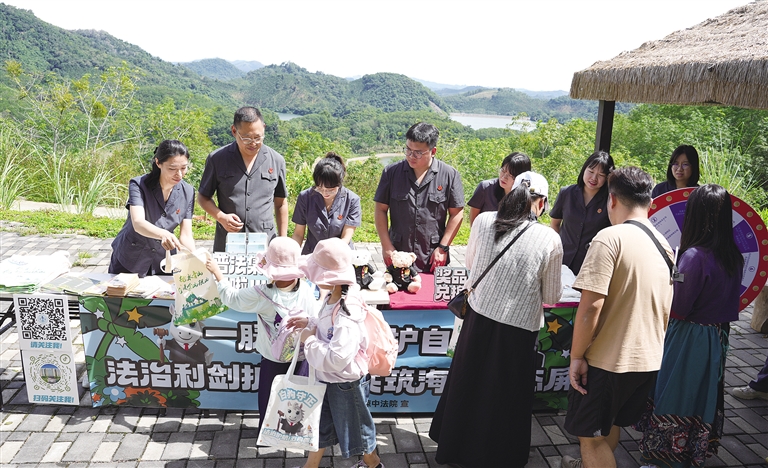 今年8月,在琼中百花岭瀑布广场,线上直播一宗滥伐林木案巡回审判。该案中,被告人王某某越界砍伐林木后,法院不仅依法判处王某某刑罚,而且将其补种数百株树苗的生态修复成效纳入庭审考量,让“砍树要补林、违法要担责”的理念深入人心。庭审结束后开设的“法律解忧杂货铺”,通过互动游戏、现场咨询等形式,让生态保护法治意识扎根基层。