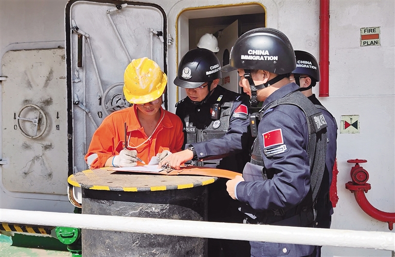 八所出入境边防检查站(以下简称八所边检站)的民警、辅警穿戴整齐,有序登上“启顺”轮开展人工抽查工作。他们分工明确、动作娴熟,有的核对船员证件信息,耐心询问,不放过任何细节;有的细致巡查船体关键部位,确认船舶安全监管无遗漏;有的则同步将查验数据录入系统,指尖在设备上快速翻飞……
