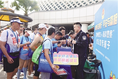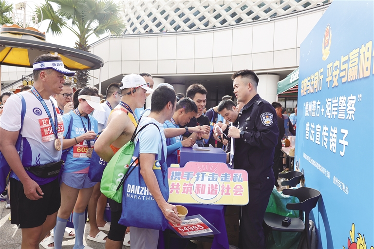 12月21日,2025海南儋州马拉松赛现场,省公安厅反走私和海岸管理总队第七支队联合儋州打私办,在赛事主会场开设“普法宣传铺子”,以“奔跑与法同行,平安与赢相伴”为主题,推出“普法有奖竞答”活动,吸引了大量参赛者踊跃参与,让参赛者在轻松有趣的互动中深化了法治意识,让赛场不仅是运动健儿挥洒汗水的竞技场,更成为普及法律知识、传递平安理念的生动课堂。