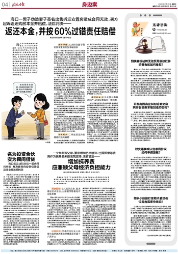 海口男子何某伪造妻子的签名,以57.6万元的价格将一套90平方米的拆迁安置房(期房)卖给罗某。3年后,安置房建好后,何某却突然向罗某提出加价20万元的要求,被罗某拒绝。当法院判决房屋买卖合同无效后,罗某起诉何某返还购房款并赔偿损失。该案历经一审二审,近日,海口市中级人民法院审理认定何某伪造配偶签名是导致合同无效的首要原因,其行为违背诚信应承担主要责任(60%),判决何某在返还本金后,再向罗某赔偿损失。