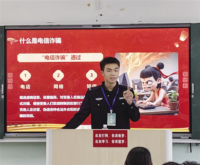 在海口市灵山镇东营中学初一年级教室里,一场关于校园欺凌的讨论正在进行。讲台上站着的不是班主任,而是来自海南政法职业学院的大学生“法治护航员”黄磊。“如果你遇到被人故意撞倒还被嘲笑的情况该怎么办?”一位平时沉默寡言的学生举手回答:“应该马上告诉老师,然后像护航员哥哥教的那样,记住‘不害怕、不沉默、不保留’的原则。”