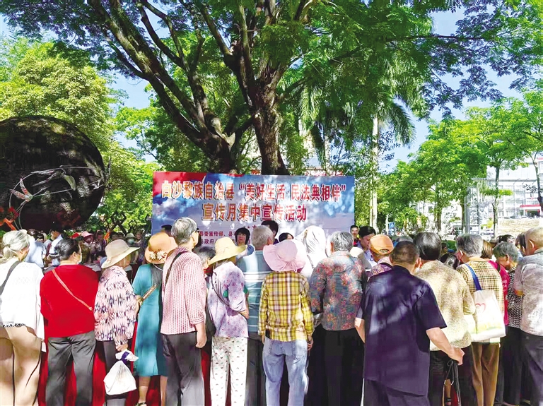 “你点单我普法”的新模式,让群众可以根据自身需求提出法律疑问,“八五”普法讲师团和“红凳子”宣讲团“接单”上门服务。为了让普法更接地气,白沙深挖民族文化资源,创新打造“一月一主题”“集市普法”等特色载体,依托“啦奥门”黎族庆丰收暨雨林山兰文化节、《少中哇》非遗项目等平台,开展形式多样、内容丰富的普法活动2400余场次。同时,充分利用“应急小广播”录制黎语普法音频定时播放,通过小品、快板等群众喜闻乐见的形式,将法条转化为生动内容,实现法治宣传与民族文化同频共振。