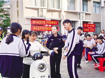 生命安全防护多措并举。该县常态化开展“护校安园”行动,加强校园人防、物防、技防建设与检查,排查化解涉校矛盾纠纷。2023年以来,各部门联合开展校园周边环境整治3288家次,指导应急演练142次,检查重点行业场所1051家次,更新维护校园周边交通标志32处。加强对学校保安员的业务培训,提升应急处置能力。严格落实上下学高峰时段“护学岗”机制,确保重点时段、重点路段“见警察、见警车、亮警灯”,累计出动警力超万人次、警车2700余辆次,有效维护了校园周边治安交通秩序。将防溺水等关乎生命安全的重点工作摆在突出位置,明确责任分工,由县委政法委、县教育局等10个单位分片包干指导乡镇落实各项防溺水措施,共同守护未成年人生命安全。