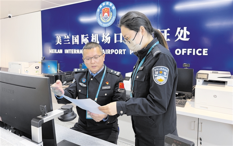 “忘带证件照的旅客,在自助照相一体机前30秒就可完成拍摄,照片自动上传系统,我们的‘人工智慧受理台’集受理、审核、制证于一体,就能完成全流程操作。”张于为介绍,春运期间,口岸出入境客流持续攀升,美兰边检站启动流量监测预警,动态调配警力,开足人工通道,为返乡旅客、外籍游客提供高效服务。