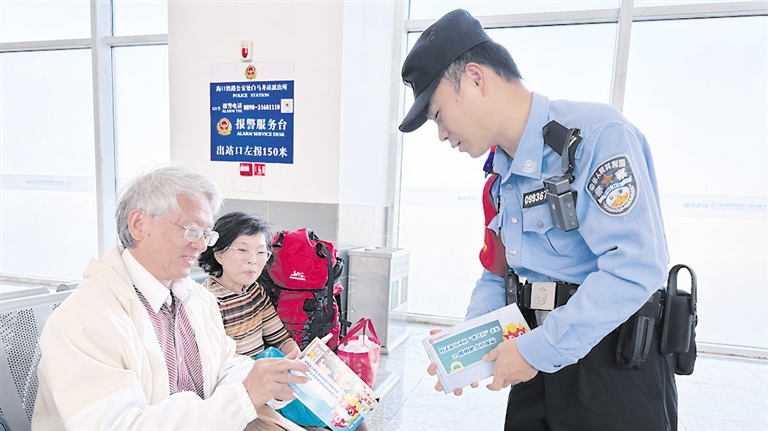 在候车大厅,新警黄文昊手持反走私宣传手册,穿梭在旅客中间,将反走私宣传融入春运服务,把安全提醒送到旅客身边。