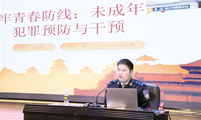 相较于家庭教育的暖心指引,法治教育的底线提醒同样必不可少,针对寒假未成年人的安全防护,海口市公安局琼山分局“护苗宣讲团”民警许发为用真实的未成年人犯罪案例解析法律规定与监护要点,实打实的内容和接地气的讲解,让在场的家长和学生边听边记,直呼“收获满满”。