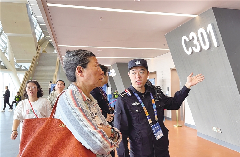 9时30分,观众陆续抵达。万云鹏和同事一边引导观众,一边协助查验票证。“我忘带身份证了,怎么办?”一位观众焦急询问。“别急,我教您在‘海易办’调取电子身份证。”民警立即帮助,让观众顺利入场。