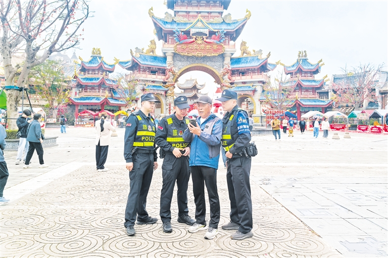 景区里,民警、辅警身兼数职,既是维护秩序的交通疏导员,也是答疑指路的景区“活地图”,更是守护平安的应急“急救员”。他们耐心细致地提供咨询引导、寻人寻物、纠纷快调、应急救助等各类暖心服务,俯身倾听解答、热心带路指引、紧急出手相助。