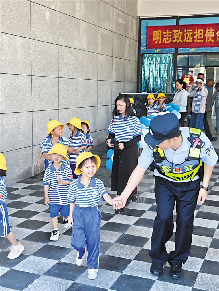 | 3月2日,三沙市公安局民警在三沙市永兴学校门口引导学校师生有序离开校园。(省公安厅供图) |