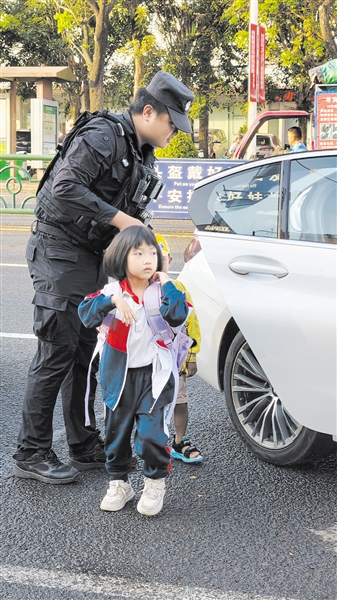 | 3月2日,定安县公安局特警大队护学岗队员为学生打开车门并安全护送下车。(省公安厅供图) |