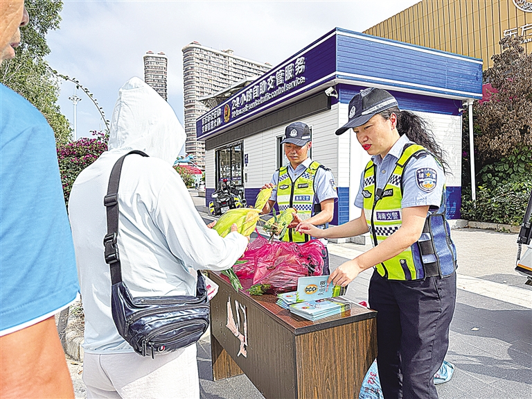 除了普及交通安全知识,现场还洋溢着暖心气息。原来,近期东方本地玉米农户遇到了销售难题。该大队主动向农户购买了滞销的玉米,并在此次宣传活动中将这些承载着爱心的玉米免费送给群众。