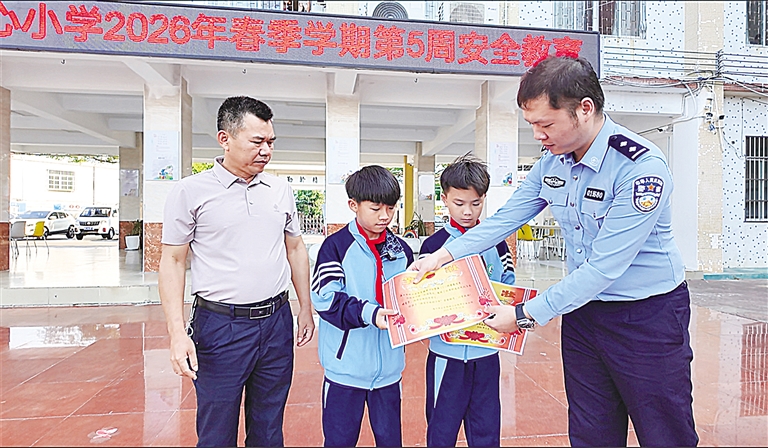 “小朋友,你们帮了我很大的忙,谢谢你们!”3月30日上午,一通从湖南打来的感谢电话,透过海口市公安局琼山分局甲子派出所民警、甲子镇中心小学法治副校长符维翰手机的听筒,传到海口市琼山区甲子镇中心小学学生梁秦和林声锐耳边。两人攥着衣角,腼腆而小声地回应:“不用谢。”