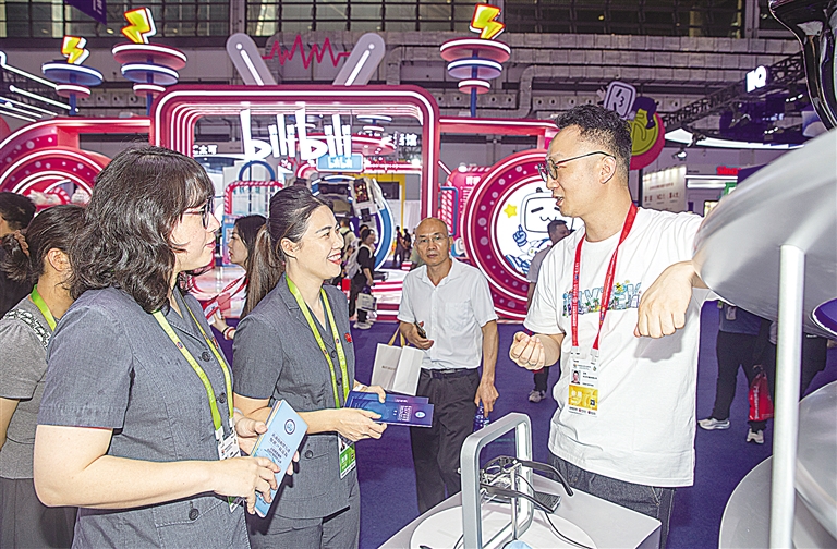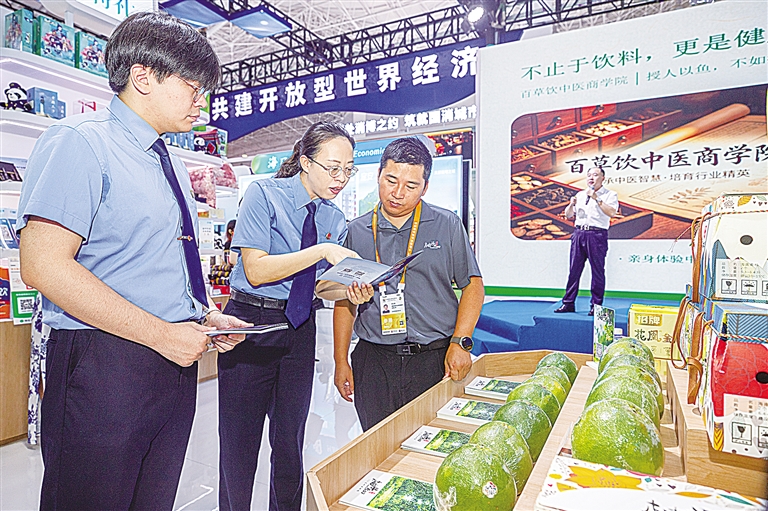 在国货精品展区,检察官助理何静和同事张天翔与参展商进行交流。记者符传问 摄