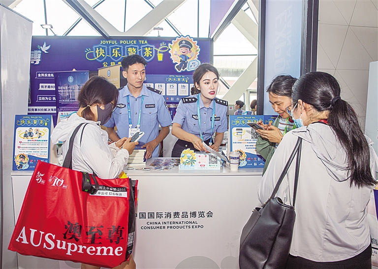 在消博会现场,海南自由贸易港知识产权法院法官周玲走进场馆,向参展商普及相关法律知识。记者符传问 摄