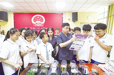 庭审结束,琼山法院刑庭干警趁热打铁,开展现场禁毒普法宣讲,有针对性地拆解青少年易接触的新型毒品陷阱。法院干警拿出依托咪酯、右美沙芬等毒品仿真模型,向师生们逐一讲解:“这些毒品常伪装成电子烟油、止咳水、网红饮料,外表极具迷惑性,专门瞄准辨别能力较弱的青少年。”